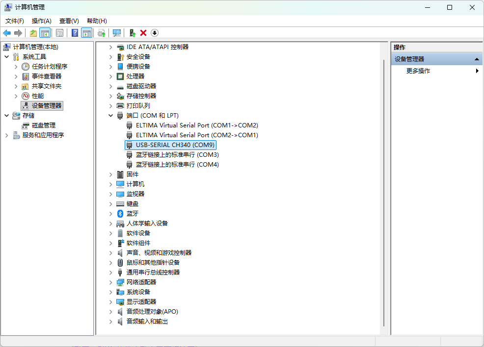 若使用真实硬件,请连接开发板与电脑,然后打开“设备管理器”(右键“此电脑”->“管理”->“设备管理器”),在“端口(COM和LPT)”下找到并记录设备对应的COM号(如COM9)。