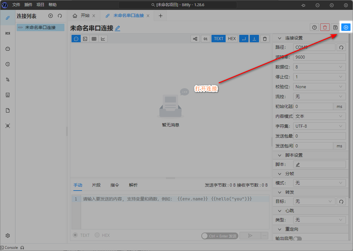 建立连接:点击“打开串口”按钮。成功后,按钮将变为“关闭串口”。