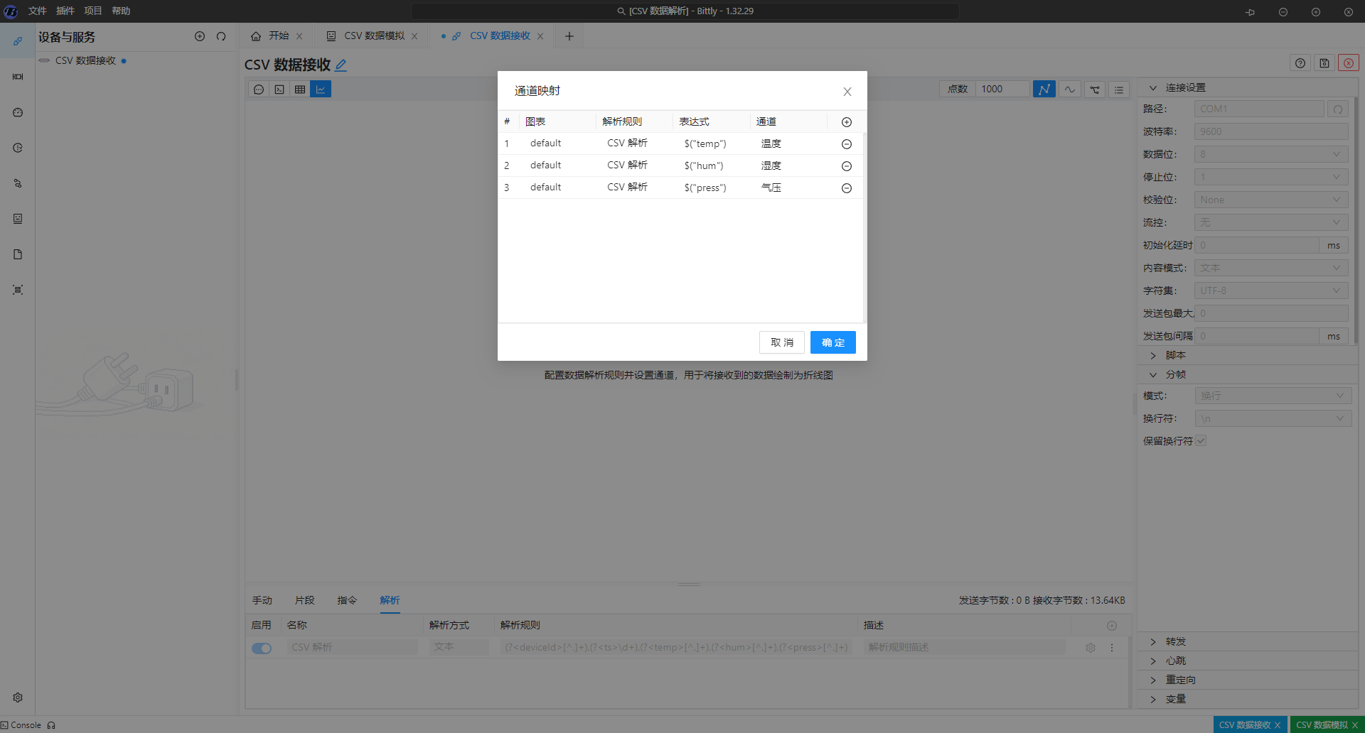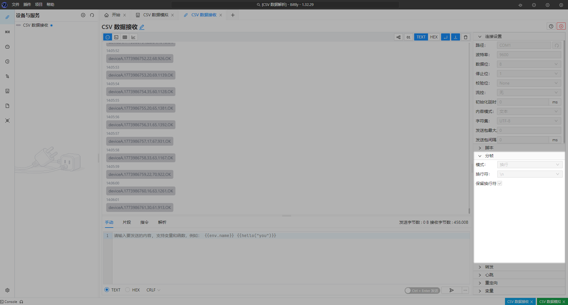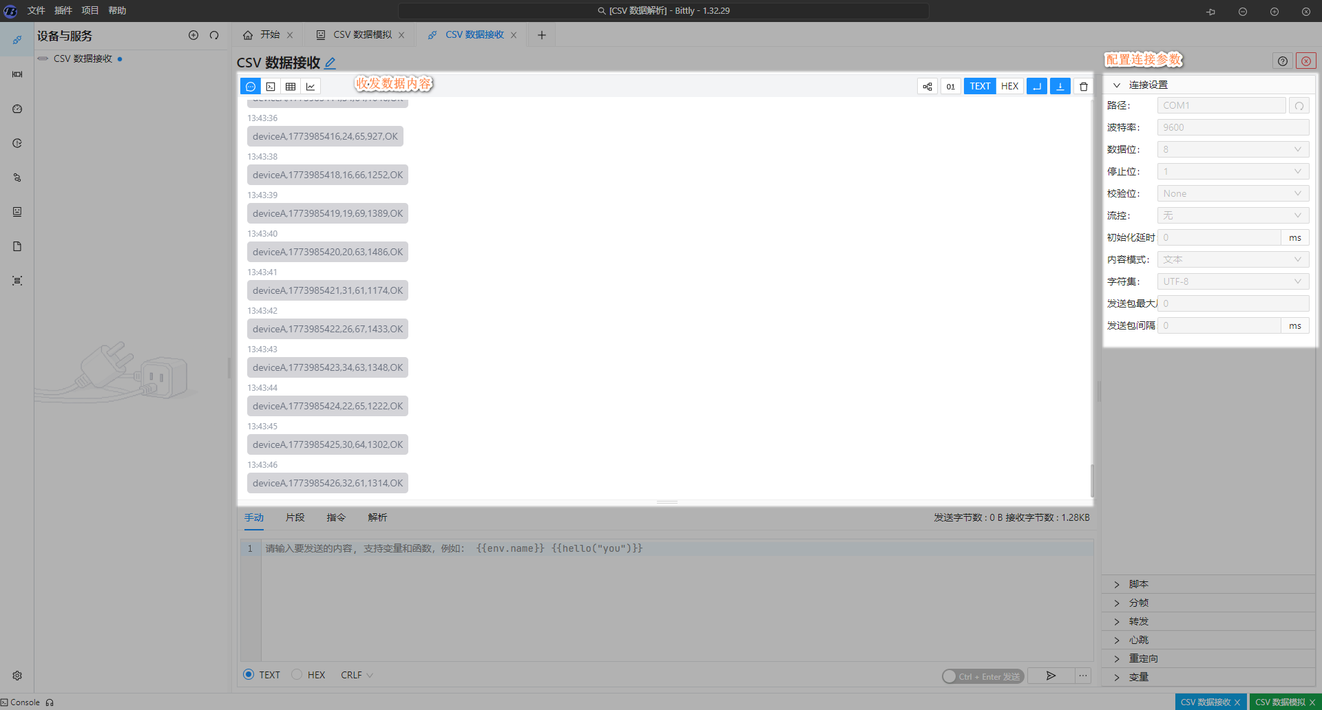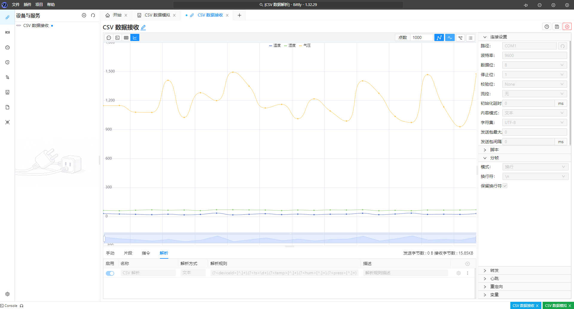 在设备调试过程中,CSV(逗号分隔值)是一种非常常见的数据格式。无论设备通过串口、TCP、UDP 还是蓝牙通信,只要输出的是 CSV 数据,都可以通过 Bittly 进行解析并实时可视化。