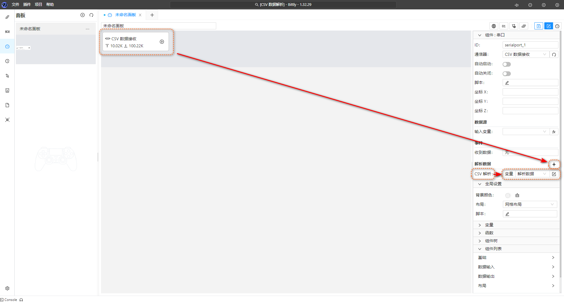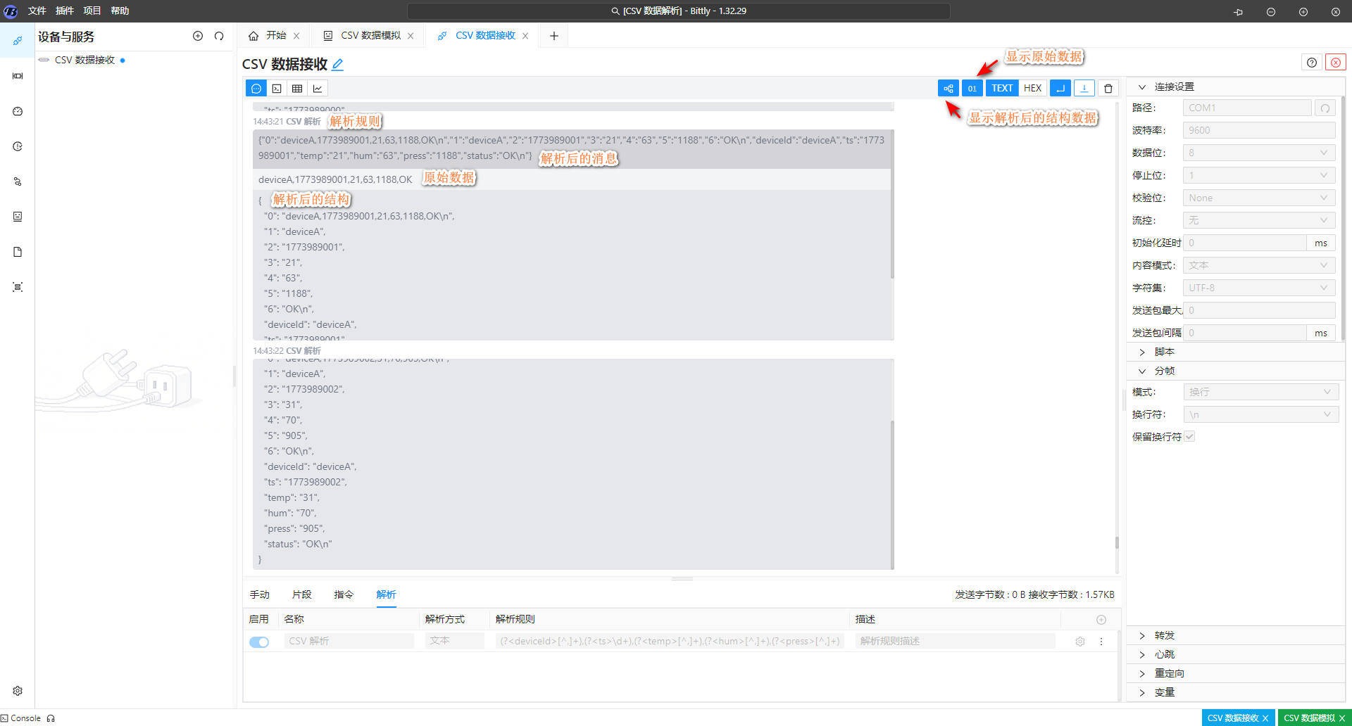 这样, 当串口收到数据后便会进行数据解析, 通过 CSV 解析 这条规则解析出的数据便会存放在变量 解析数据中 。