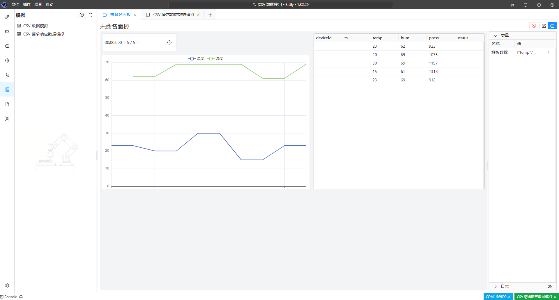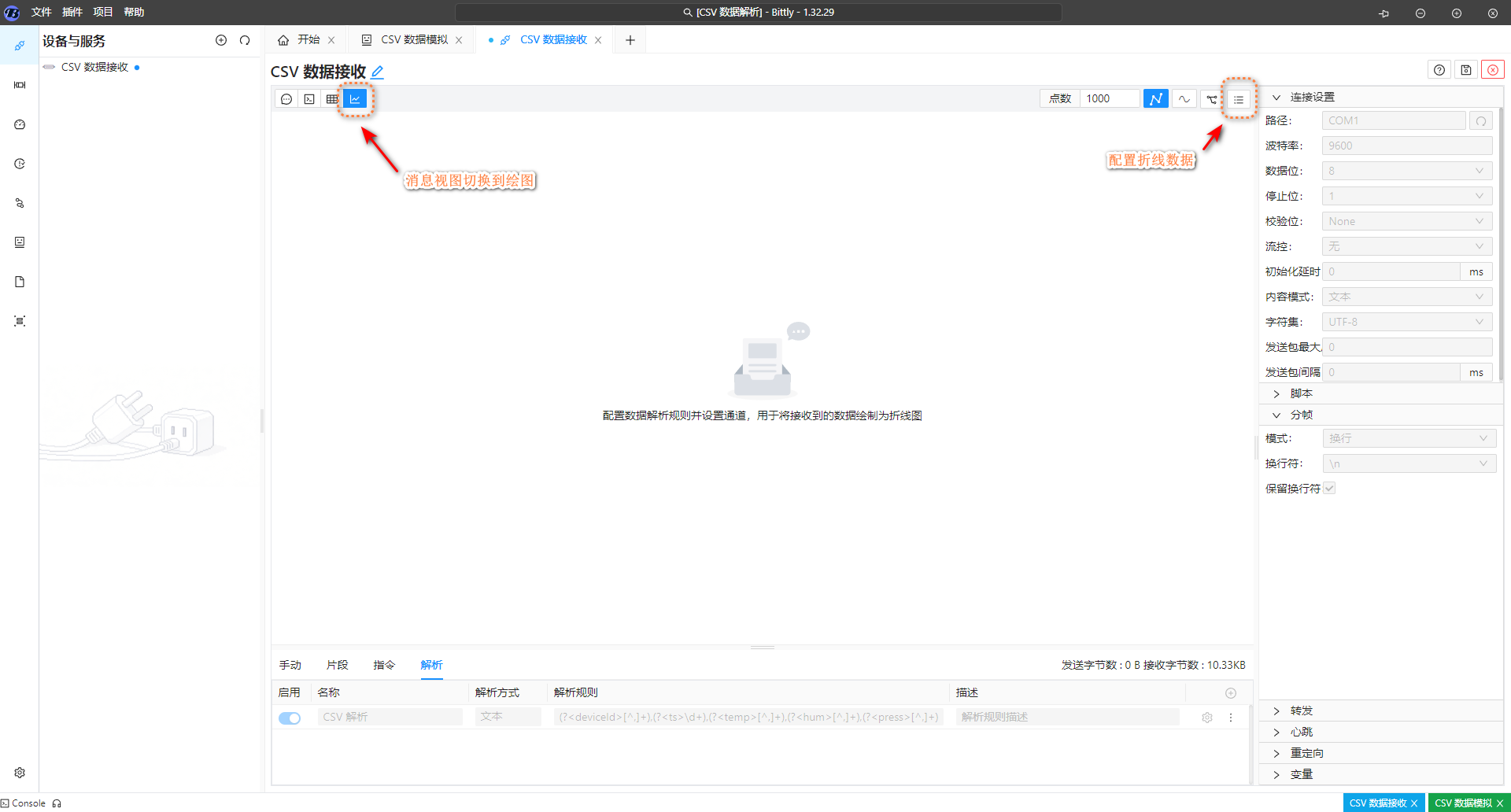 在该模式下,设备上电后会主动发送 CSV 数据,无需上位机发送指令。Bittly 可以直接通过通讯连接接收数据,并按照配置的解析规则进行解析与可视化。