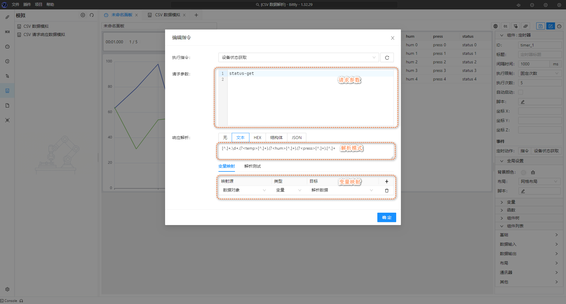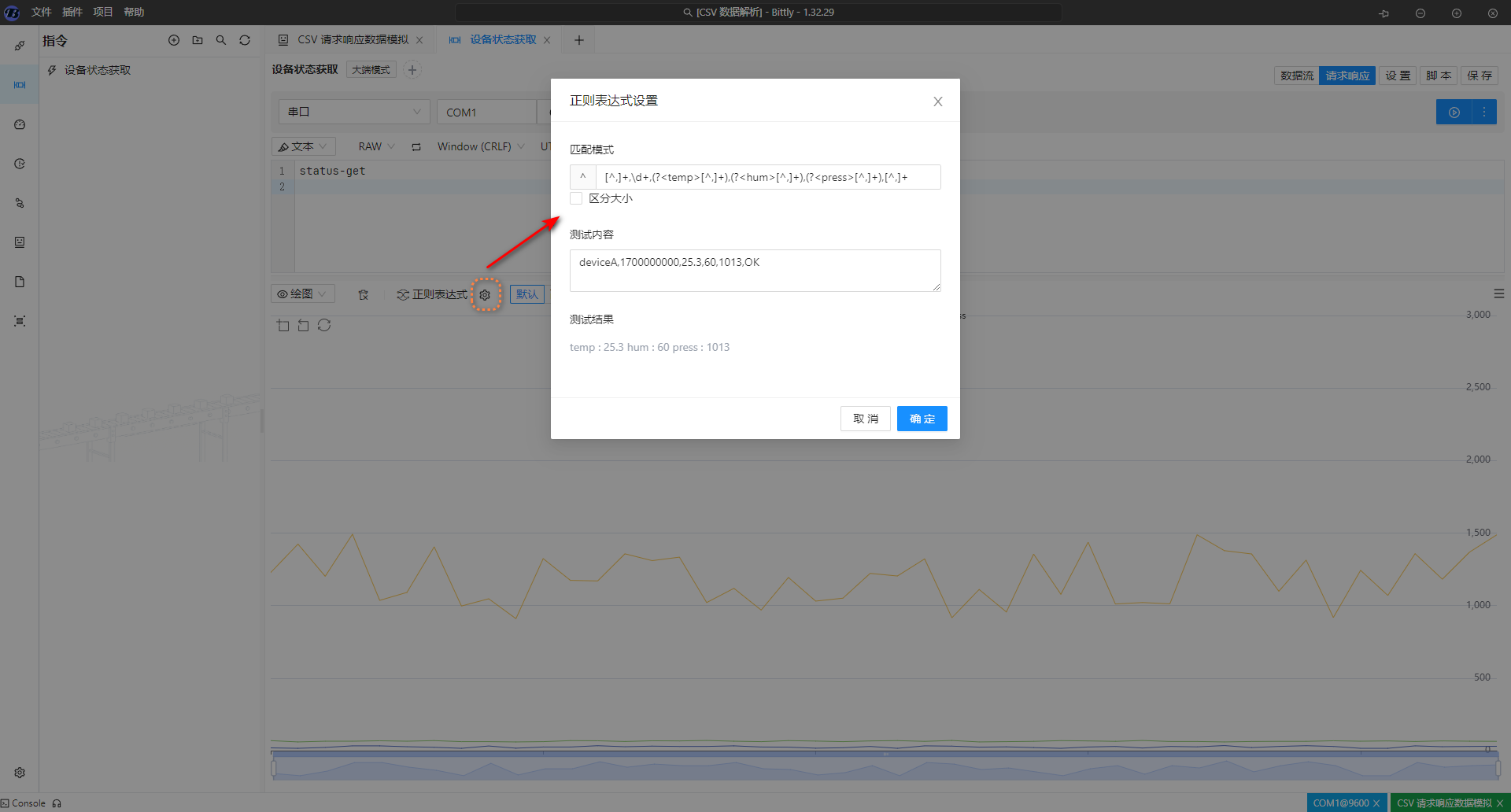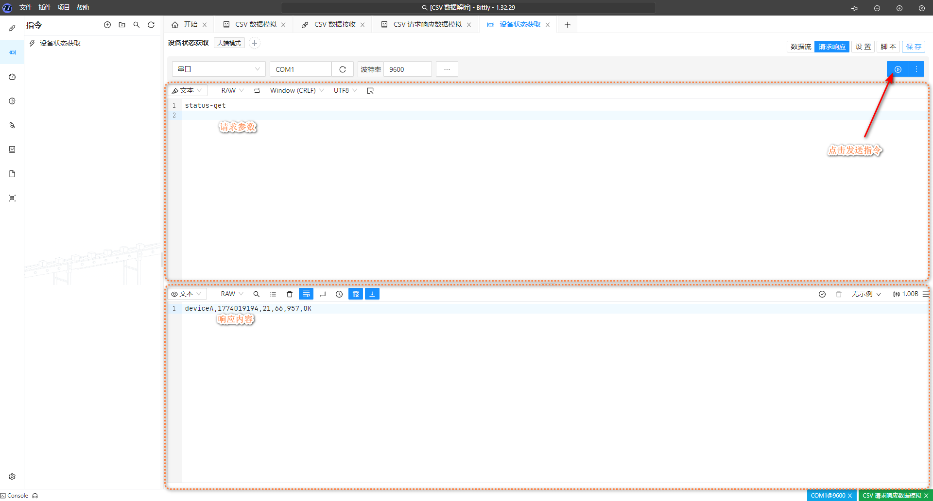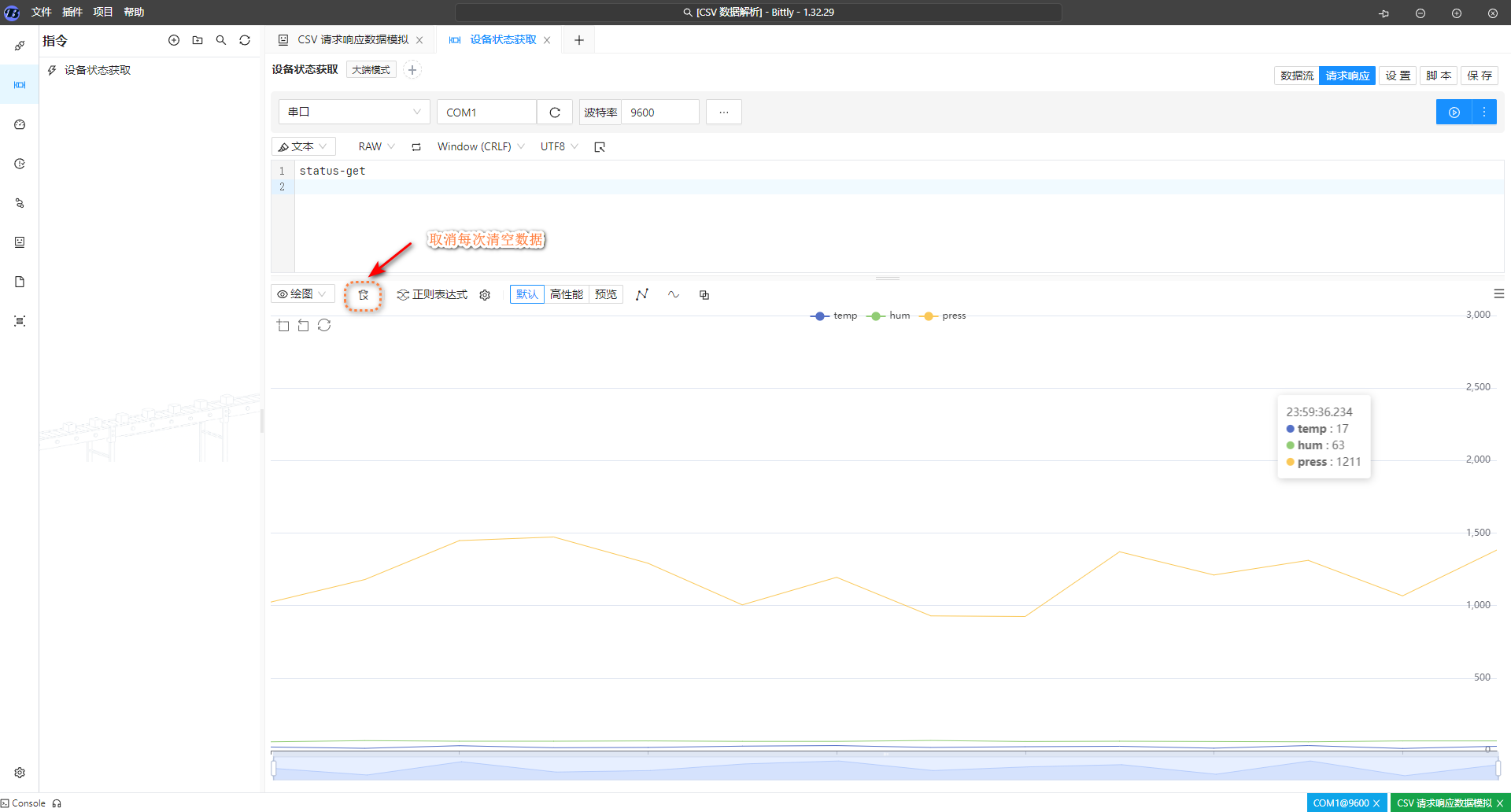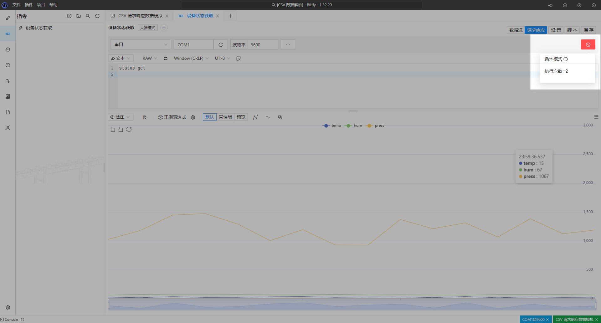 在该模式下,设备不会主动上报数据,而是需要由上位机发送指令后,设备返回一条 CSV 数据。Bittly 可以对指令响应内容进行解析,并用于绘图或数据处理。