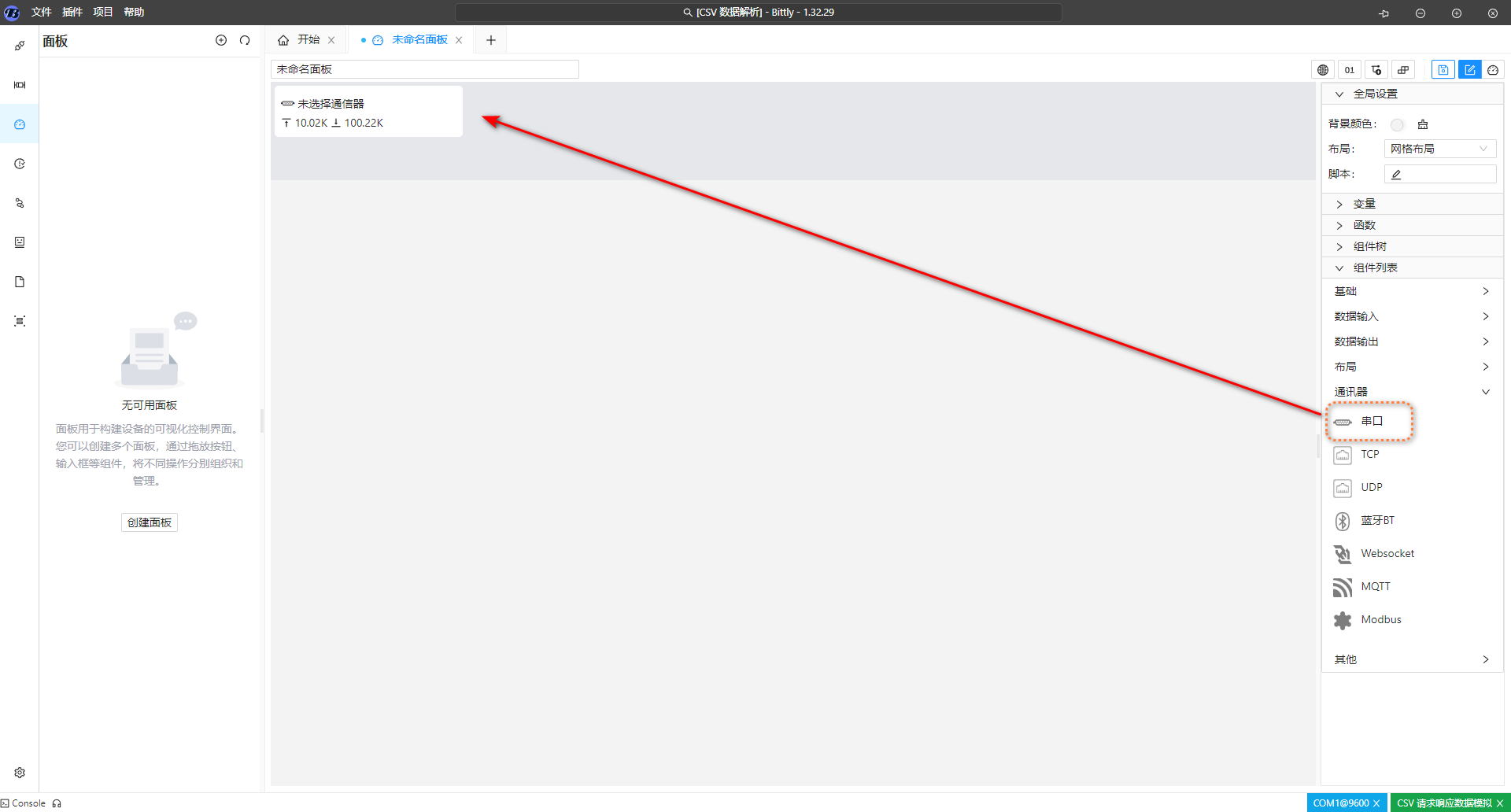 从组件列表中选择 "串口连接" 组件添加到面板中: