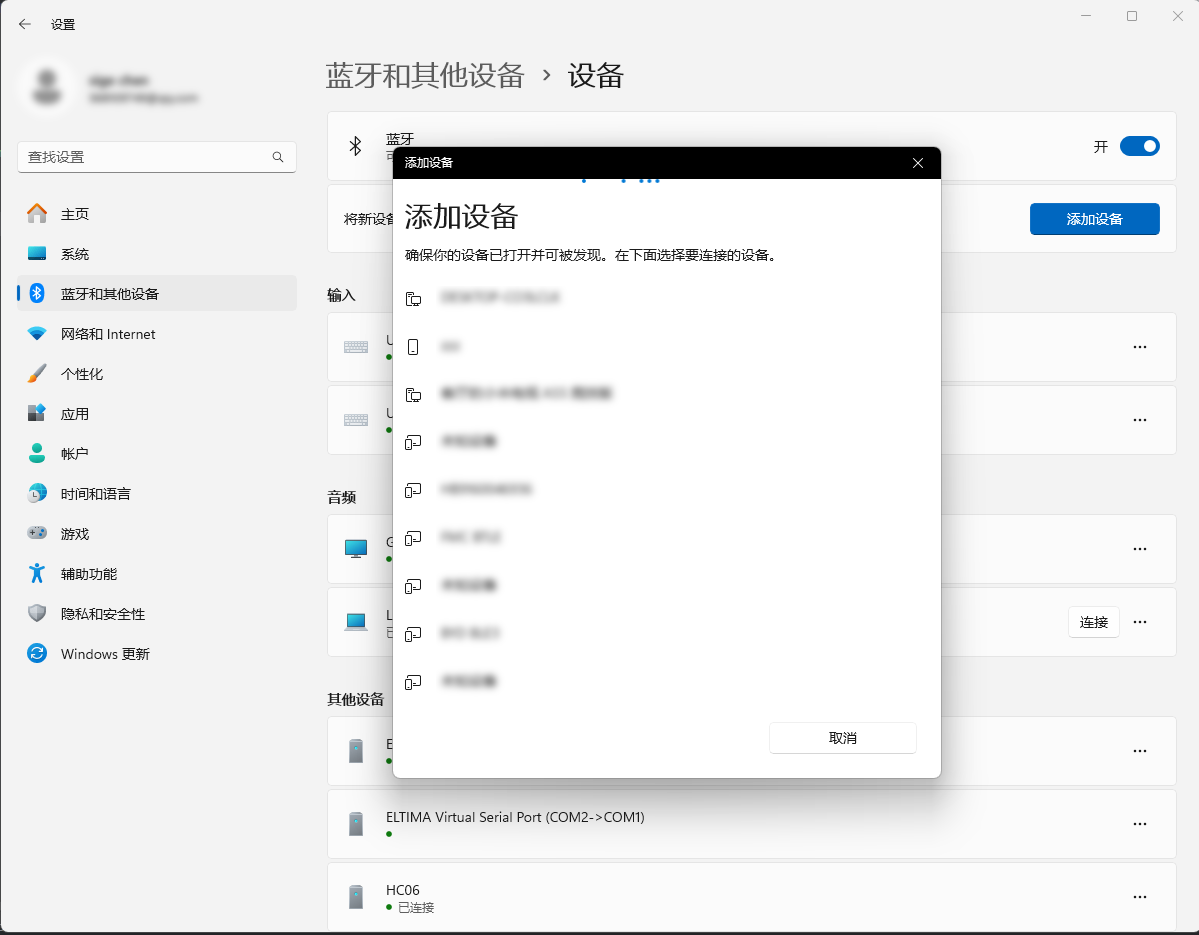 打开 Windows 蓝牙置,扫描并将 HC-06 蓝牙模块配对连接。