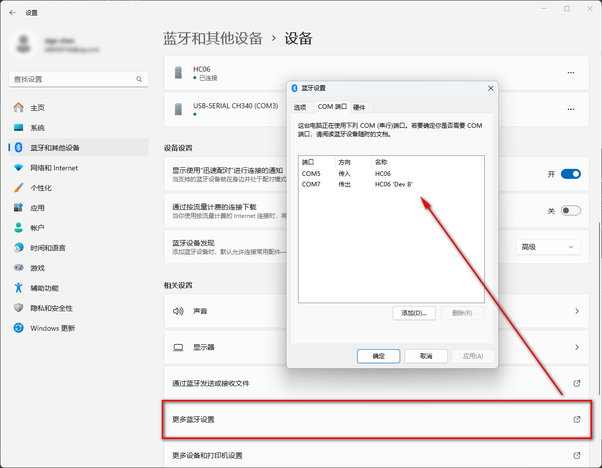 选择 更多蓝牙设置 将 HC-06 蓝牙模块映射为串口。
