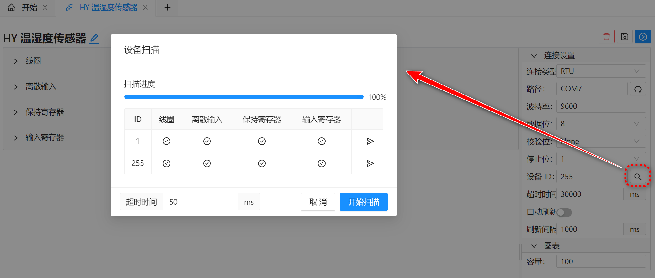 扫描结束后,可通过右箭头图标将选中的设备ID设置到设备ID输入框中。