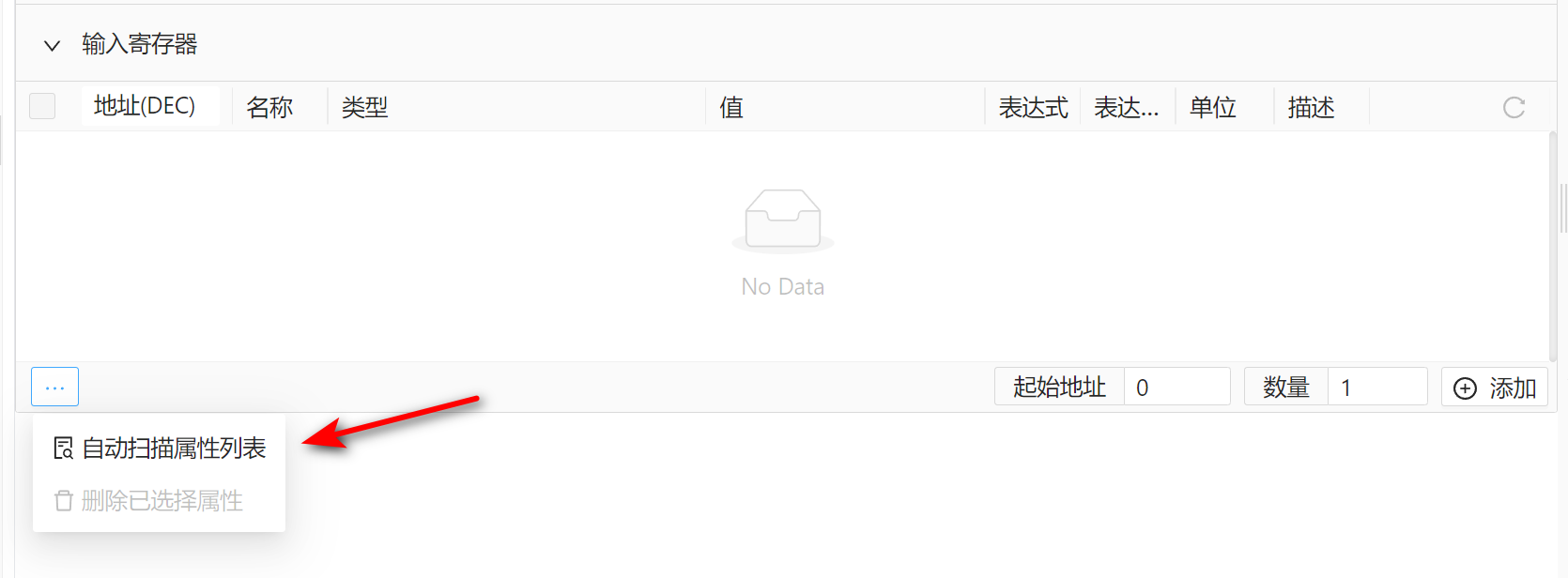 地址 : 保持寄存器属性地址, 可通过点击地址区域进行修改,并通过表头格式切换十进制或十六进制。名称 : 保持寄存器属性名称, 可通过点击名称区域进行修改, 属性名称不可重复。类型 : 保持寄存器属性数据类型, 不同的数据类型可配置不同的扩展属性 :