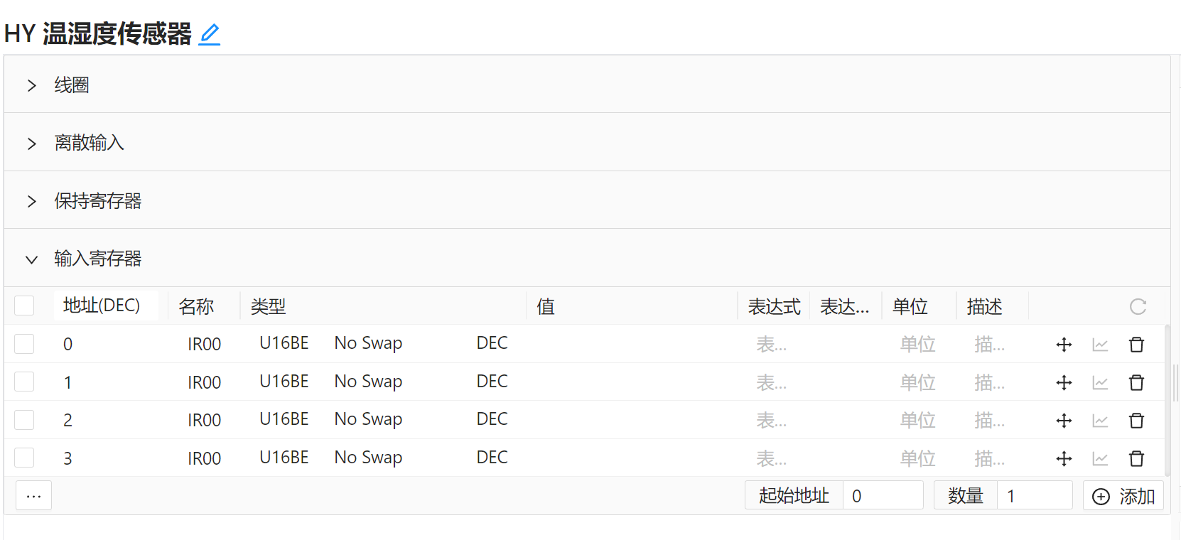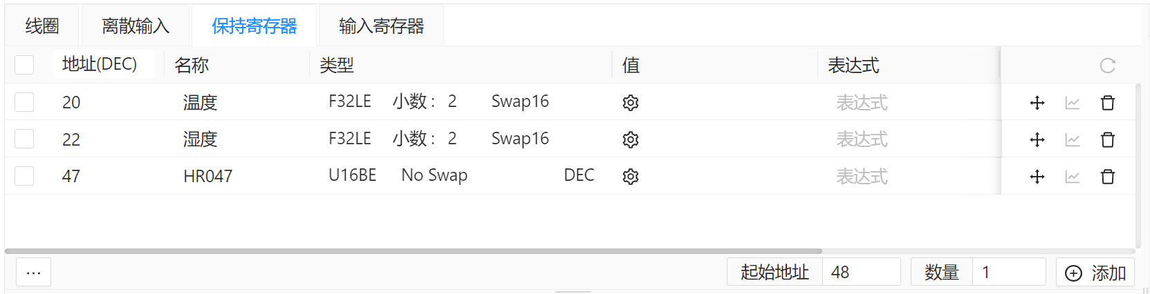 取值 : 显示当前保持寄存器取值。如需修改取值,可点击修改图标进行修改,在修改数据时,输入数据的格式同数据类型的配置, 例如,如果数据类型设置位BIN 则输入数据也需要为二进制格式。表达式 : 保持寄存器表达式。表达式用于计算保持寄存器取值,例如:$value * 10, 其中$value表示保持寄存器取值。表达式值 : 保持寄存器表达式值。表达式值用于显示保持寄存器通过表达式计算后结果。单位 : 保持寄存器单位。描述 : 保持寄存器描述。