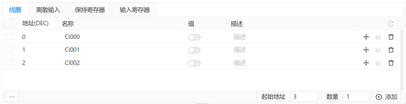 地址 : 线圈属性地址, 可通过点击地址区域进行修改,并通过表头格式切换十进制或十六进制。名称 : 线圈属性名称, 可通过点击名称区域进行修改, 属性名称不可重复。取值 : 线圈属性取值, 可通过切换开关状态来更新线圈取值,并且在数据刷新时,取值会自动更新。描述 : 线圈属性描述, 可通过点击描述区域进行修改。