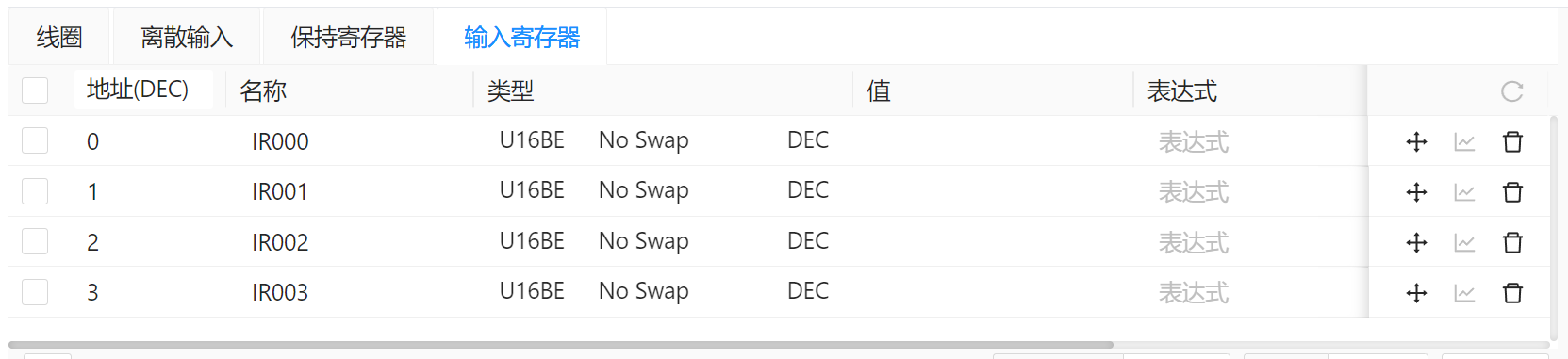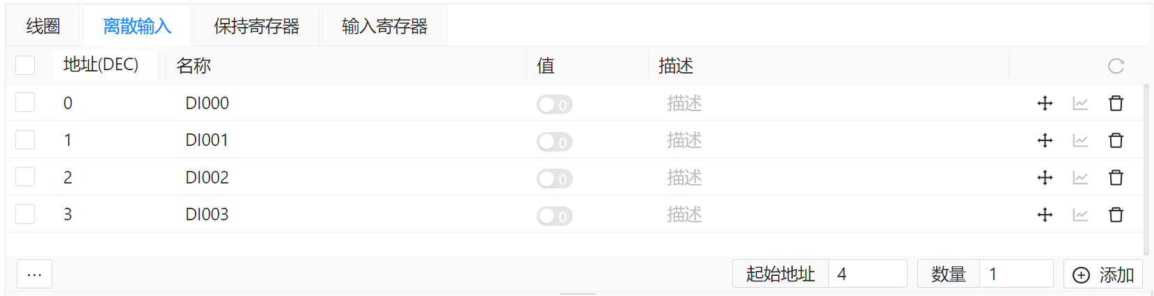 地址 : 离散输入属性地址, 可通过点击地址区域进行修改,并通过表头格式切换十进制或十六进制。名称 : 离散输入属性名称, 可通过点击名称区域进行修改, 属性名称不可重复。取值 : 离散输入属性取值, 当数据刷新时,取值会自动更新。描述 : 离散输入属性描述, 可通过点击描述区域进行修改。