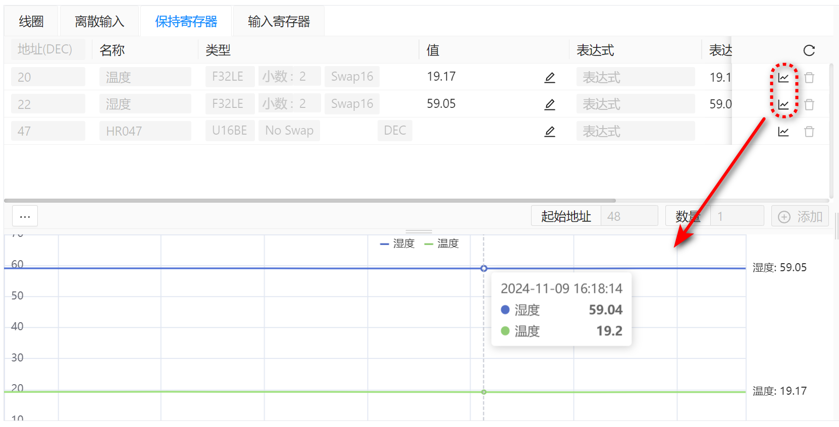 地址 : 输入寄存器地址,并通过表头格式切换十进制或十六进制。名称 : 输入寄存器名称。类型 : 输入寄存器类型, 配置同保持寄存器类型。取值 : 显示当前输入寄存器取值。表达式 : 输入寄存器表达式。表达式用于计算输入寄存器取值,例如:$value * 10, 其中$value表示输入寄存器取值。表达式值 : 输入寄存器表达式值。表达式值用于显示输入寄存器通过表达式计算后结果。单位 : 输入寄存器单位。描述 : 输入寄存器描述。在通讯连接启动后, 可将属性值添加到折线图中以方便观察数据变化。 Bittly 支持同时将多组属性值添加到折线图中。